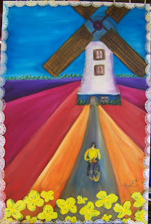 The opinions of others are not always valid, but when the first two people to see the finished painting commented that they missed spokes in the wheels, I paid attention and quickly added the idea of spokes. I dipped the sharp edge of a palette knife into the greens and very lightly touched it to the inside of the wheels. You can only see all the spokes on a stationary bike. I therefore paint only a few that the light seem to reflect off.