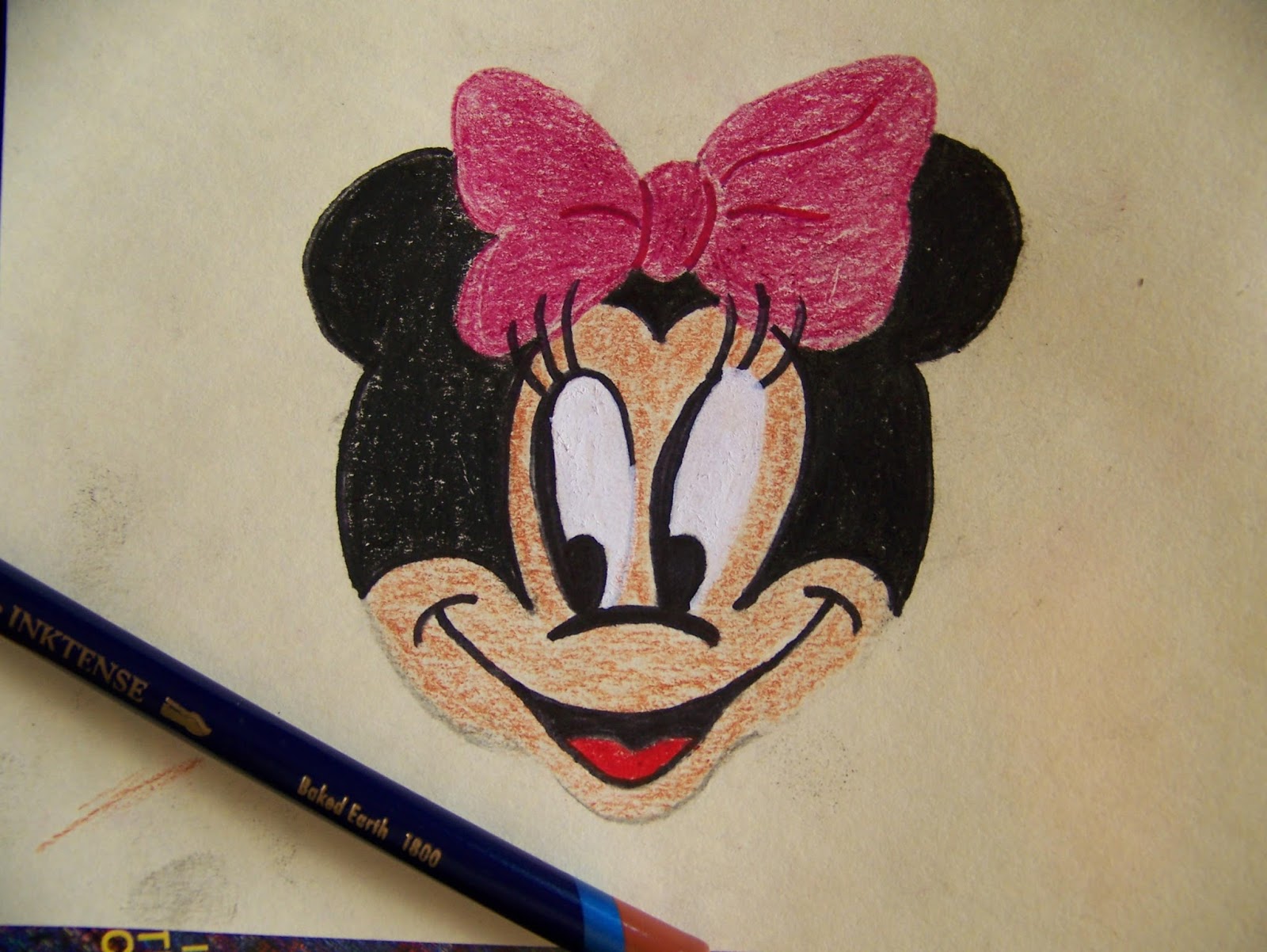 For now I simply finish the card with two rhinestone embellishments. Remember to check back in for tomorrow's blog when we do the inside of the card and draw Minnie Mouse's body as well.