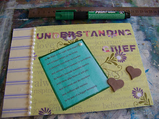 I now add a single pearl bead to the top of my poem, bringing home the new meaning of the poem to me. I also stick two brown clay hearts onto the cover of the album. This is what my heart looks like at the beginning of this journey. It is a far cry from the glazed purple heart on the back cover. What does your heart look like right now? Acknowledge this and give yourself permission to feel the way you do. By denying yourself this privilege, you will not be able to fully experience the restoration process.