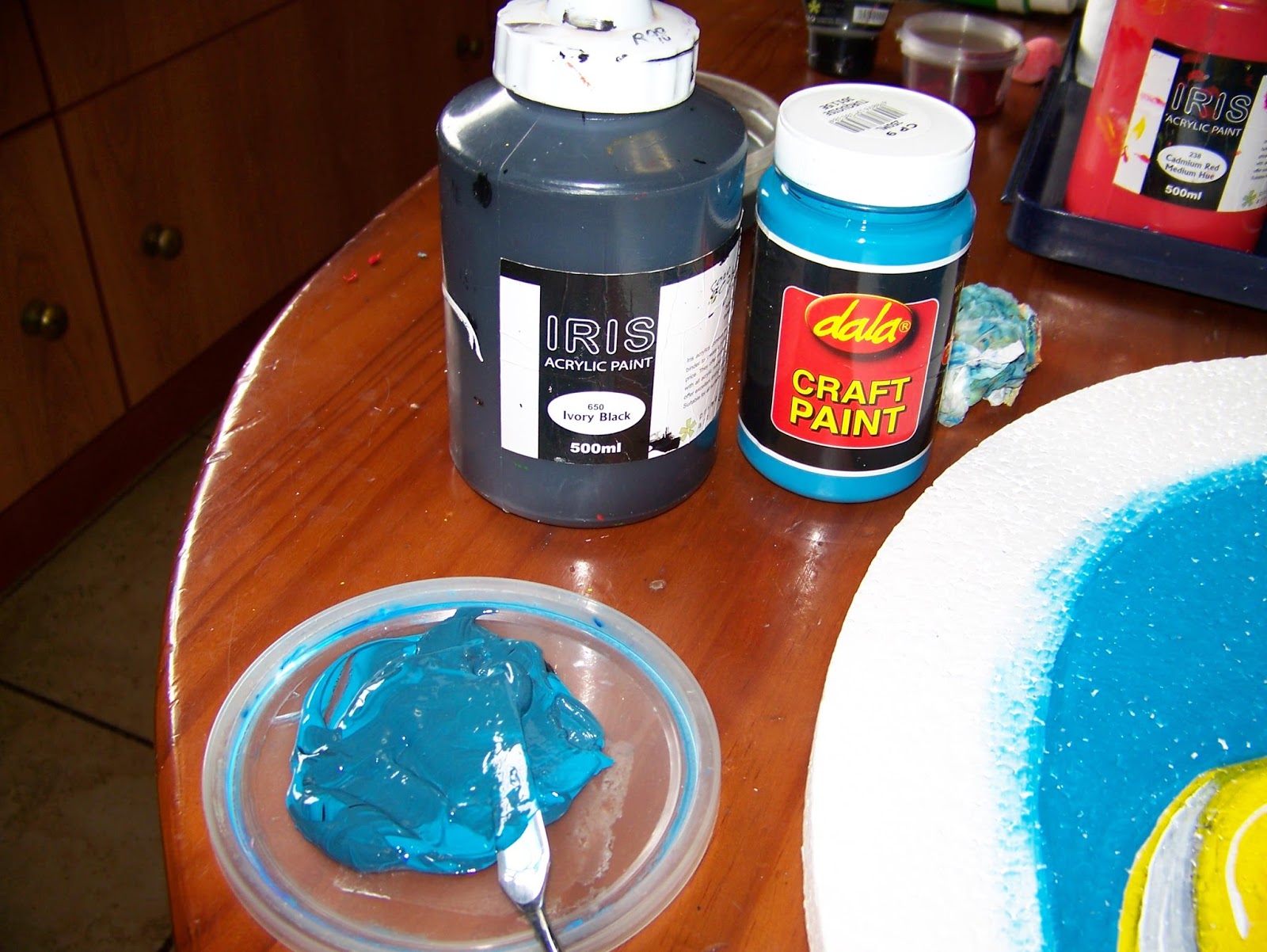 There are three kinds of paint that you can use with great success on polystyrene. Most acrylic paints will work brilliantly. Most fabric paints will also work very well. But my first choice will always be Dala Craft Paint. The colours are simply more vibrant than many of its counterparts. A word of caution: always read the labels on the containers carefully to make sure that the paint is safe to use in polystyrene. I have actually seen my projects melt away before my eyes after simply assuming the paint was 'safe' to use. You should especially check metallic colours and glitter glues. In fact, ALL glues should be checked on an off-cut piece of polystyrene before use. May as well test those paints as well while you're at it.