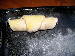 Starting at the wide side of the triangle, begin rolling the dough up.