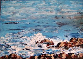 I repeat these steps to the middle third of my painting, which is the ocean, reflecting the colours of the sky above it. Note that I have softened the horizon line into almost oblivion. This aids in creating the impression I want to leave the viewer with when I am done. I am stripping the painting of detail, blending distinct features, so as to give the viewer a soft and soothing place to rest the eyes. It is only when standing back from the picture that shapes will slowly identify themselves and the picture will start to take shape. If I can achieve this, I have reached the goal I was aiming for. When I reach the bottom third of the painting, I start by laying down large areas of white. This is where the surf starts as the water crashes onto the rocks, forming foam on choppy waters.