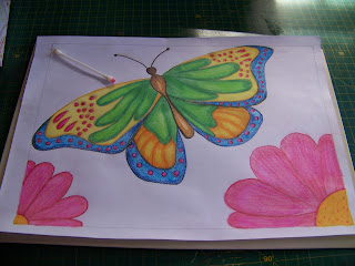 I then went to my adult colouring books to find a suitable picture to colour. As usual, I was disgusted to find that the pictures are made up of hundreds of small spaces that do not lend itself to shading or blending! That was when I turned to my own Design book, Designs By Miekie 1. (You can simply click on the highlighted words if you wish to purchase a copy of the ebook). I liked the butterfly series for what I wanted to do and quickly traced the design, as my printer was out of ink. Fortunately, I had the original to work from!