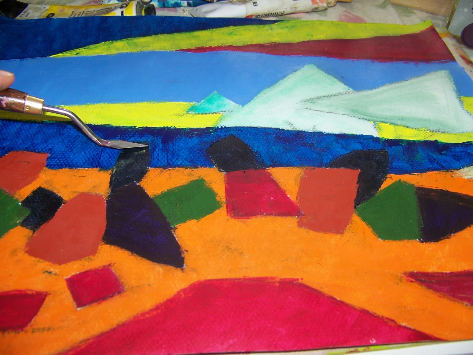 Once dry, I paint the first colour with a palette knife. I use very thin layers of paint and scrape the excess paint away with the palette knife.