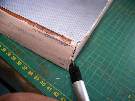 Put the lid on the box and use an awl to make two equally-spaced holes through the lid and the box. Make sure you do not work in the line of the 'leather strips'. We do not want to cover these up, but will make features of them.
